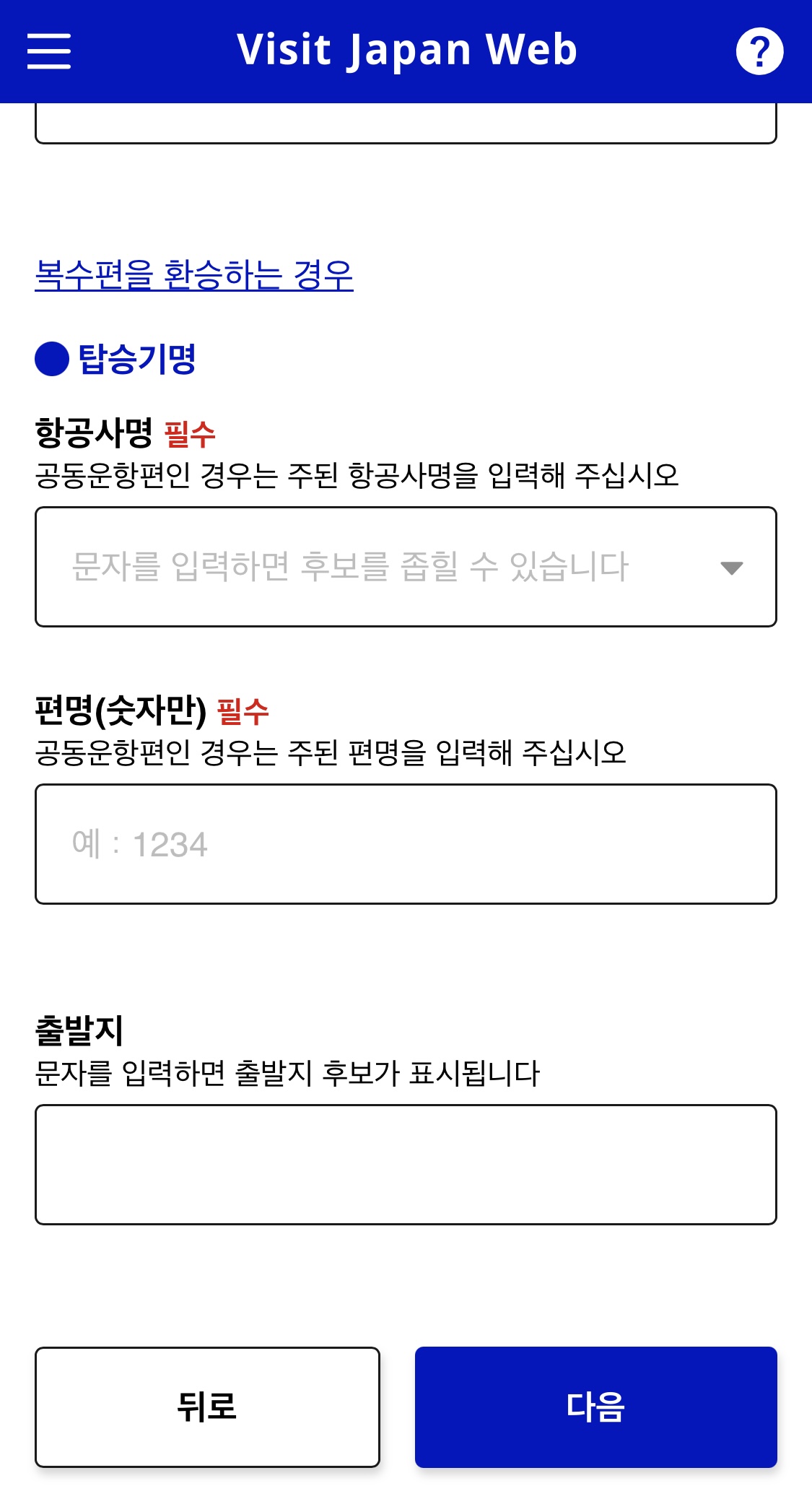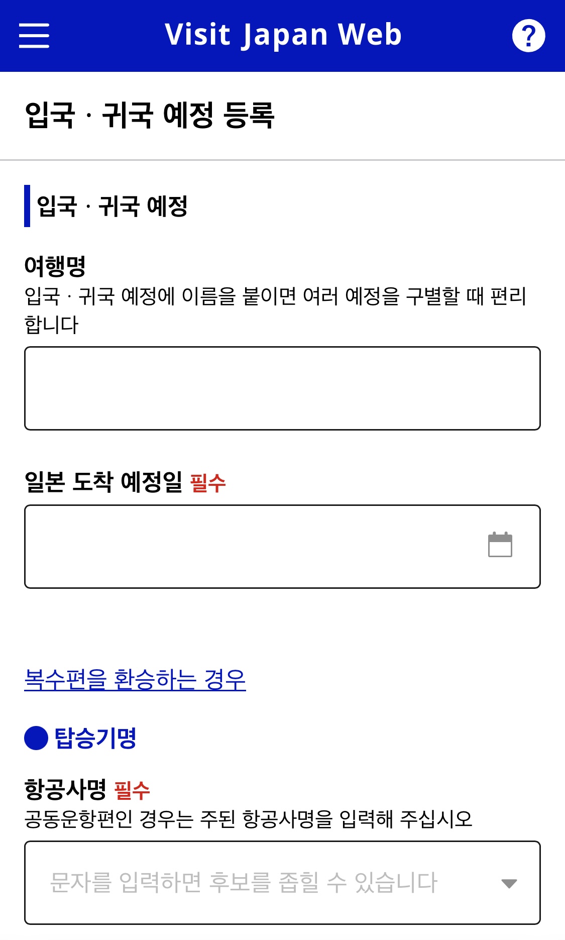 방문자 프로필을 선택하고 날짜, 입국예정인 공항, 항공편 정보, 일본 내 숙박 예정주소 등을 입력합니다.